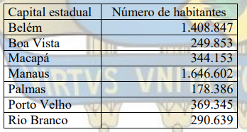 A tabela a seguir apresenta o número de habitantes das capitais estaduais da Região Norte do Brasil.