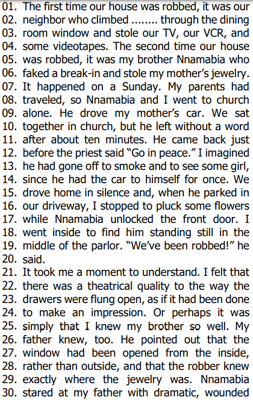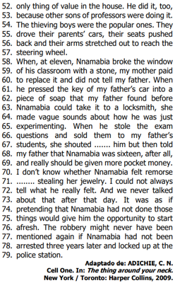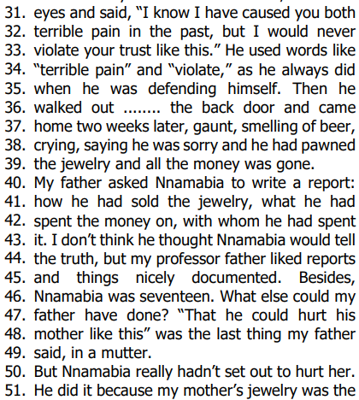 A narradora rememora os vários delitos cometidos por Nnamabia ao longo da infância e da adolescência e sugere que a escalada de risco, e de gravidade, das ações seriam consequência de más influências e da leniência dos pais, que nunca o puniram com rigor.