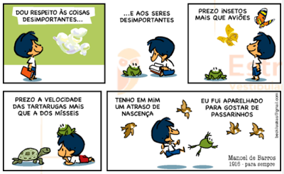 A tirinha de Armandinho apresenta uma homenagem ao poeta Manoel de Barros, por ocasião de sua morte em 2014. A partir dela, pode-se entender que o poeta: