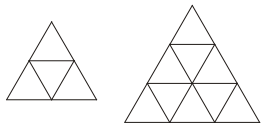 O triângulo equilátero T à direita tem lado 1. Juntando triângulos congruentes a esse, podemos formar outros triângulos equiláteros maiores, conforme indicado no desenho abaixo.