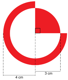 Na figura, vê-se uma forma geométrica em vermelho que foi obtida pela junção de um setor circular de raio 3 cm e ângulo 90º com um setor de uma coroa circular de raio interno 3 cm,